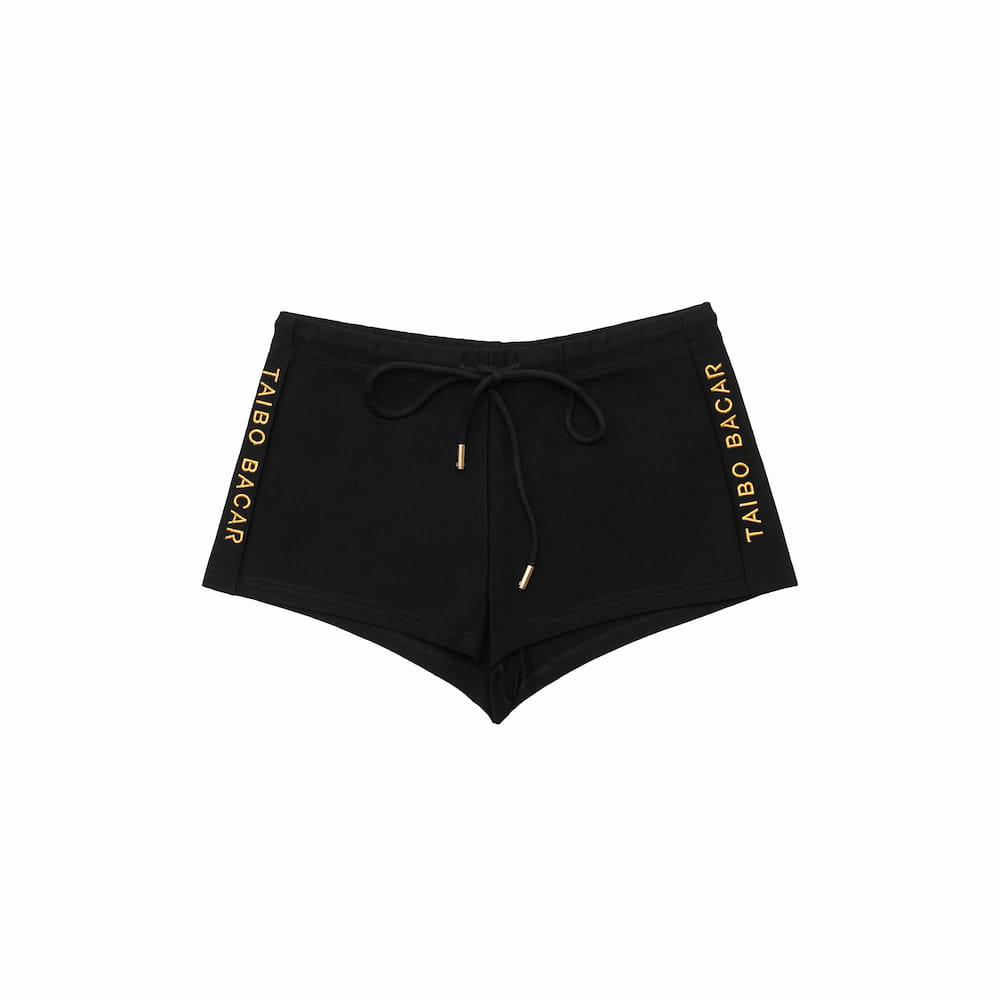 Shorts crafted from non-insulating fabric, high thigh length. Exercise-friendly or perfect for a casual day. Features tie strings and a gold TAIBO BACAR embroidery.