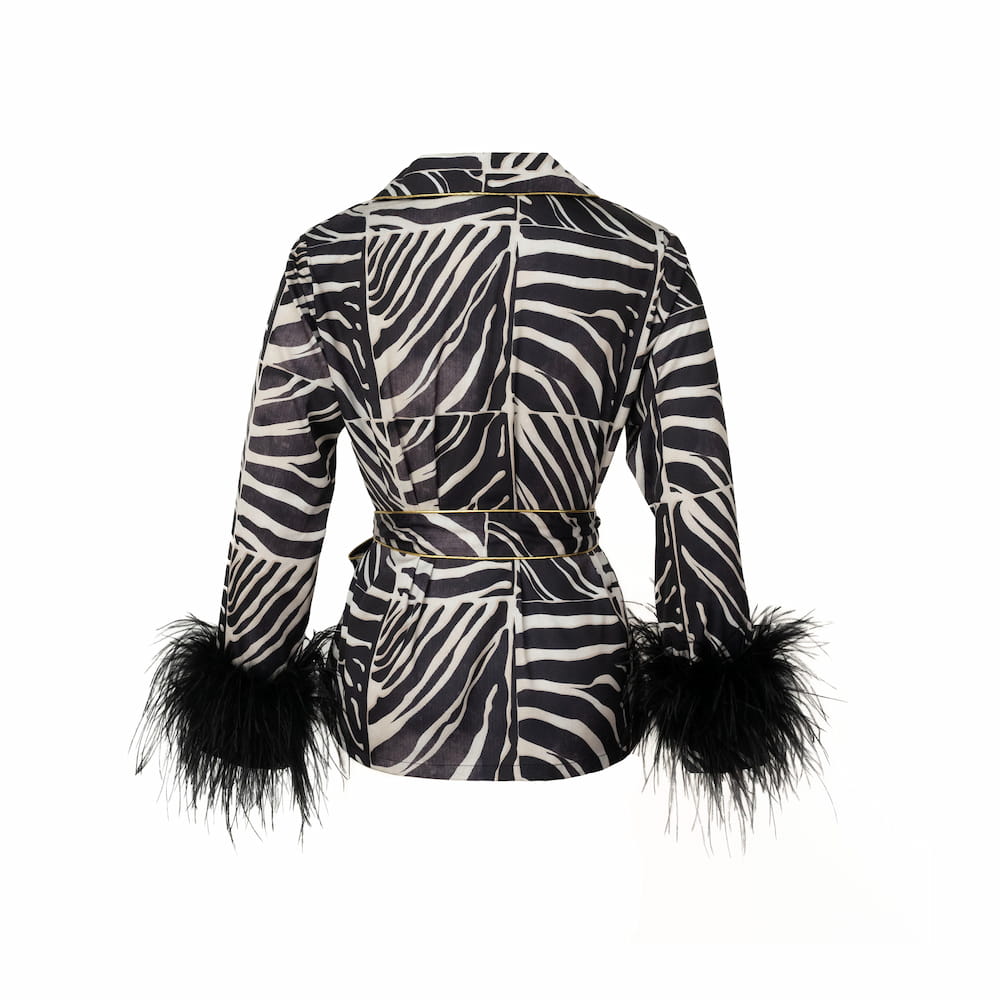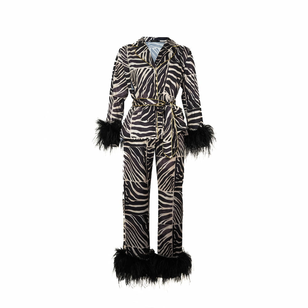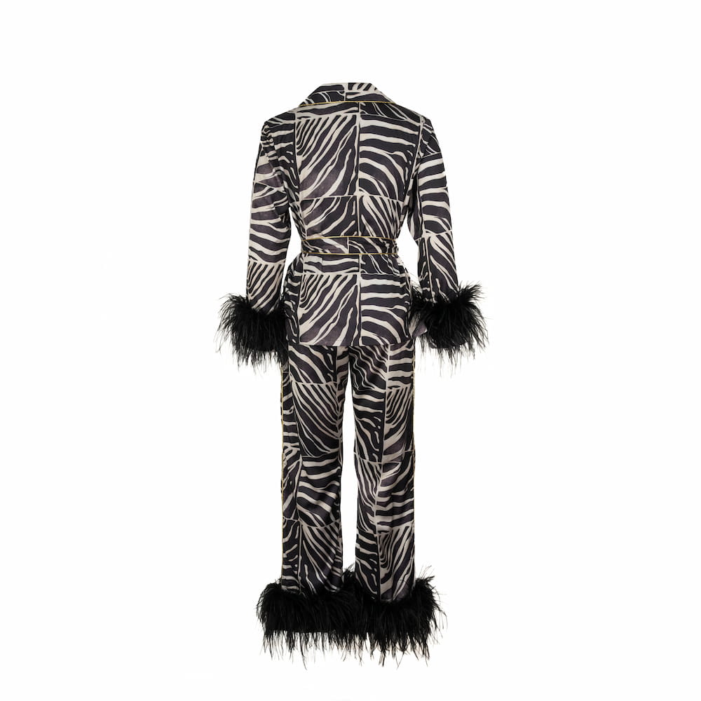 Iconic #TAIBOBACAR street pyjama set returns under the new collection. In a graphic Square Zebra print, detailed with clean gold seams and sleeve feather accents. The timeless loungewear shape is cut from soft, fluid silk for everyday comfort.