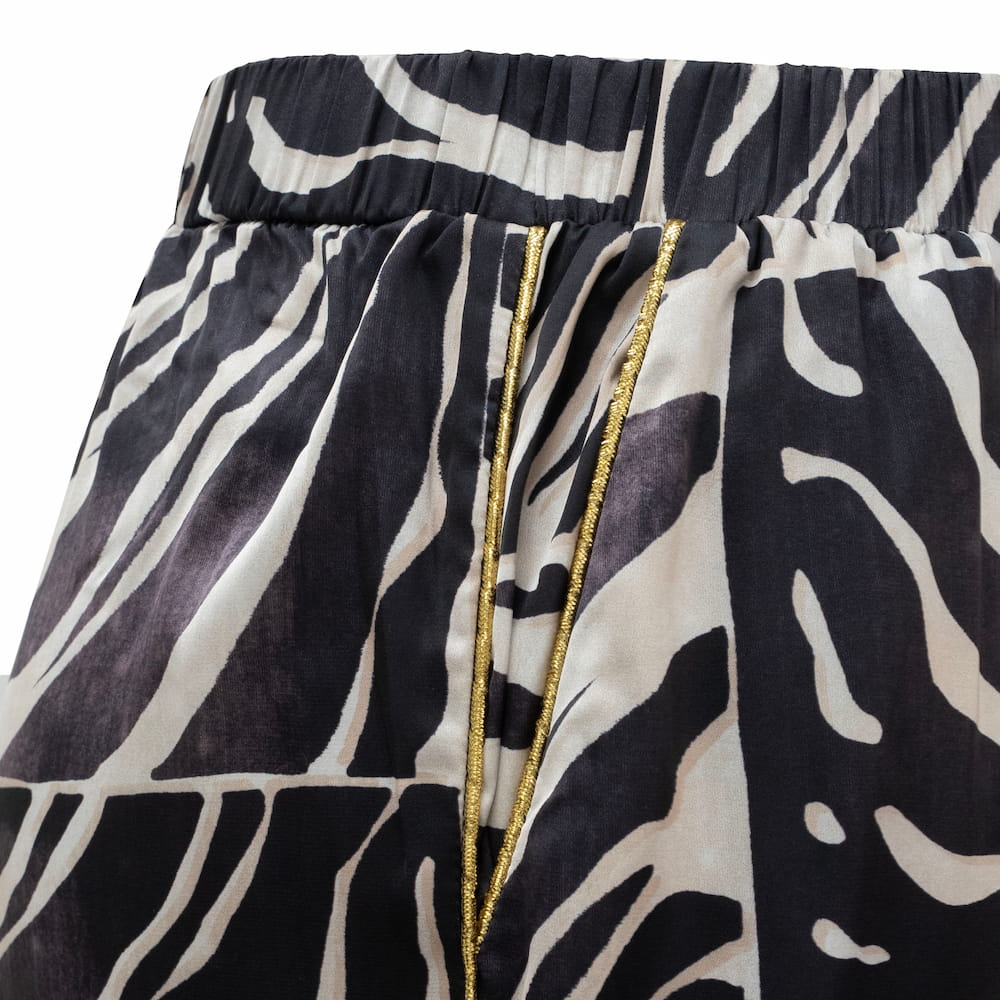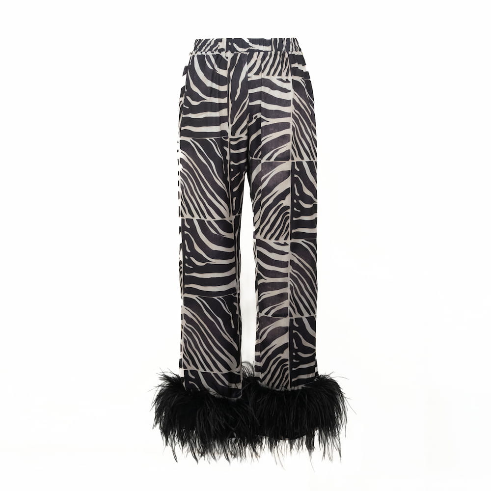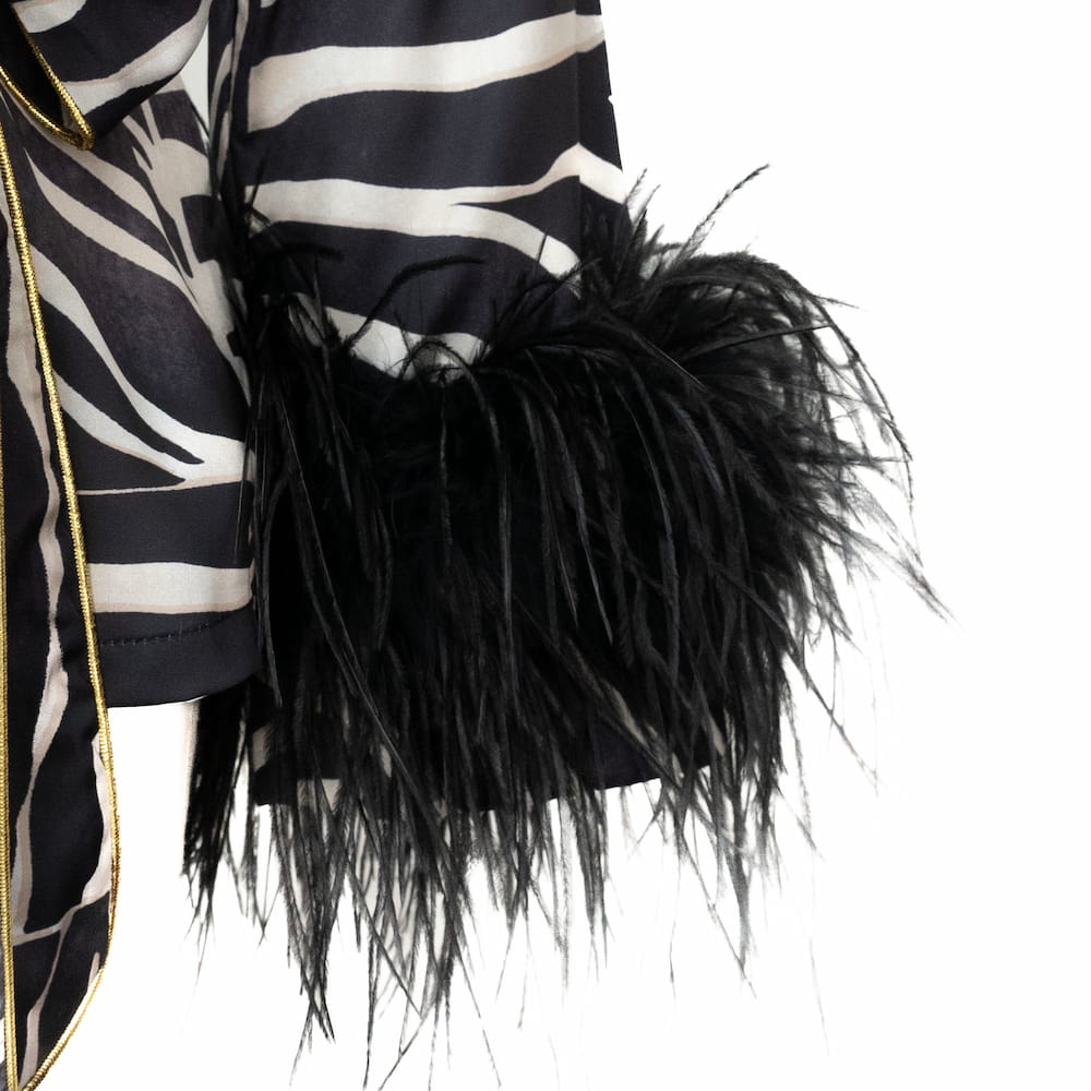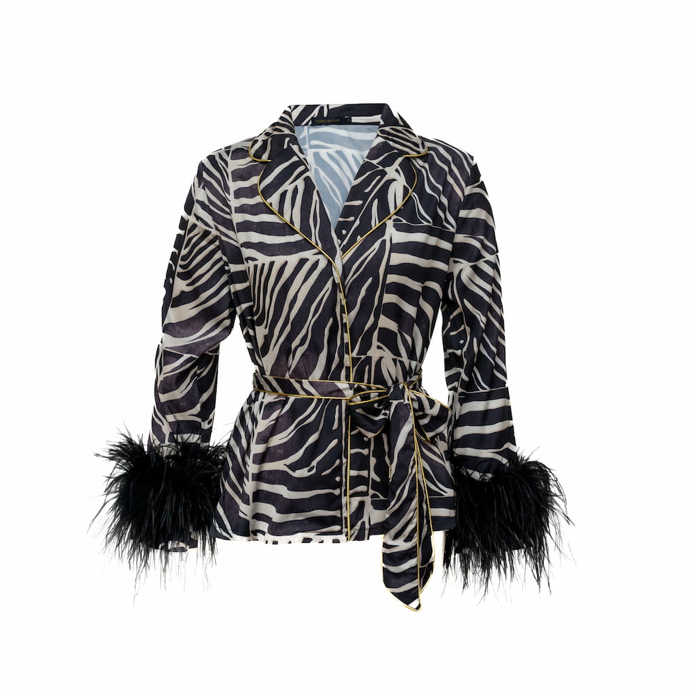 Iconic #TAIBOBACAR street pyjama set returns under the new collection. In a graphic Square Zebra print, detailed with clean gold seams and sleeve feather accents. The timeless loungewear shape is cut from soft, fluid silk for everyday comfort.