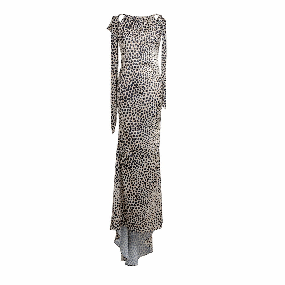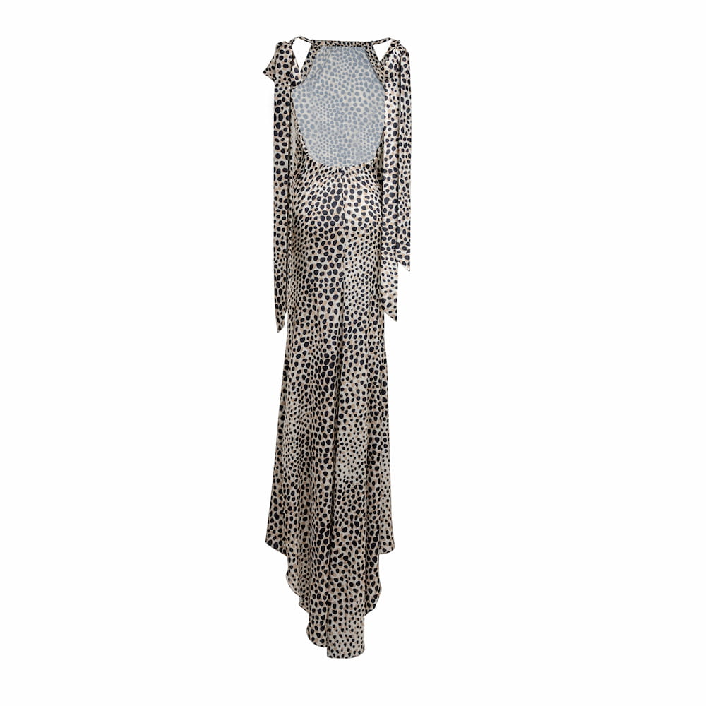 Casual and sensual, this dress offsets an elegant neckline with a plunging open back ribbed with bows and animal print details for a daring feminine look.