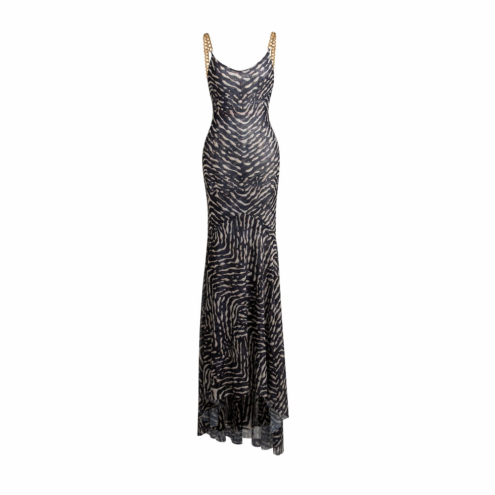 Flowy and soft detailing elevates this silk satin dress with an airy, romantic feel. The top half has a structured and tight-fitting look with a scoop neckline, metal chain straps and loose fabric around the bottom adds volume to the length skirt. An allover print of this season’s animal motif completes the look.