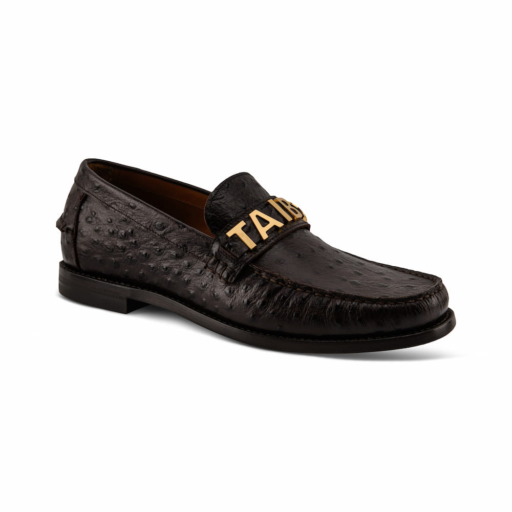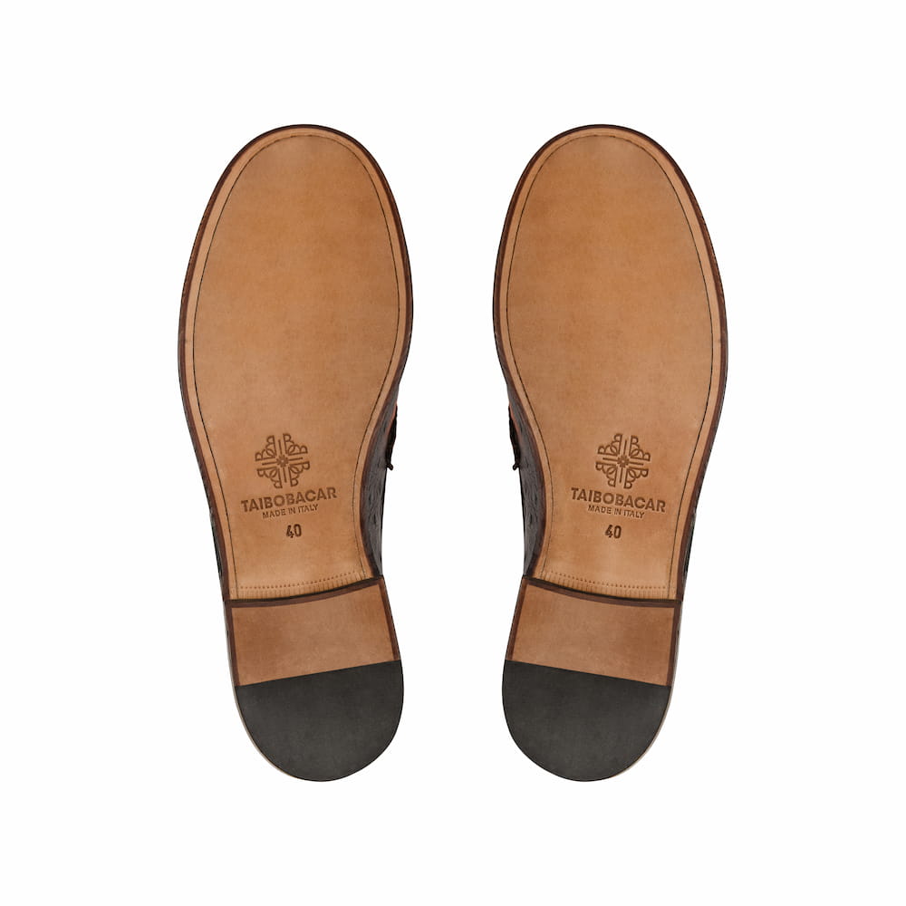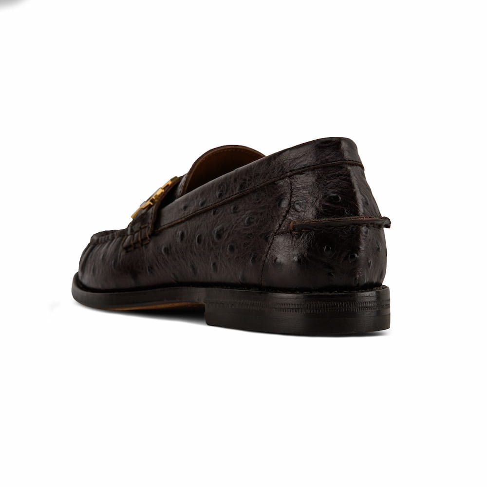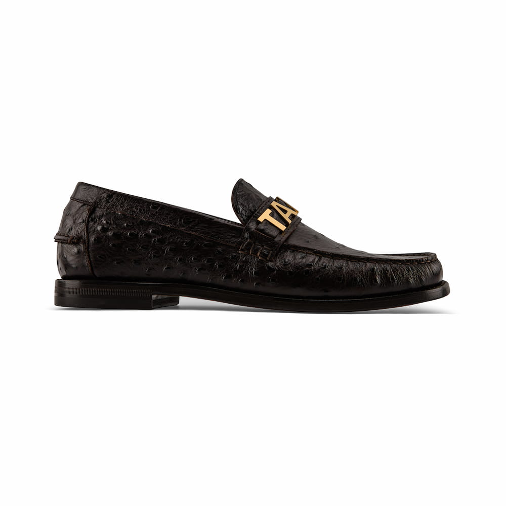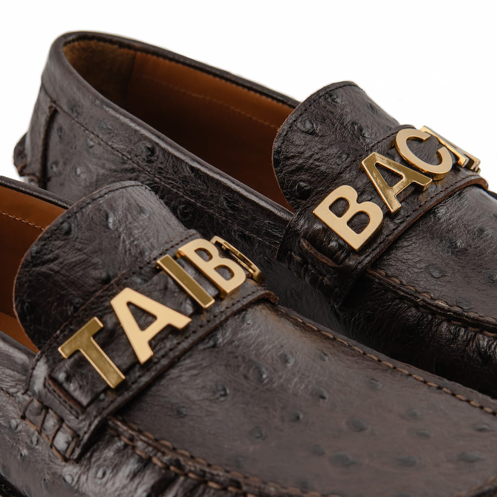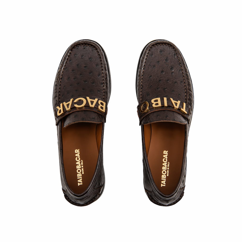 Moccasins for the season. Our Be Bacar Moccasins in brown textured ostrich leather, complemented by a gold-tone TB writing. These timeless loafers feature a high value craftsmanship, ensuring comfort without compromising style.