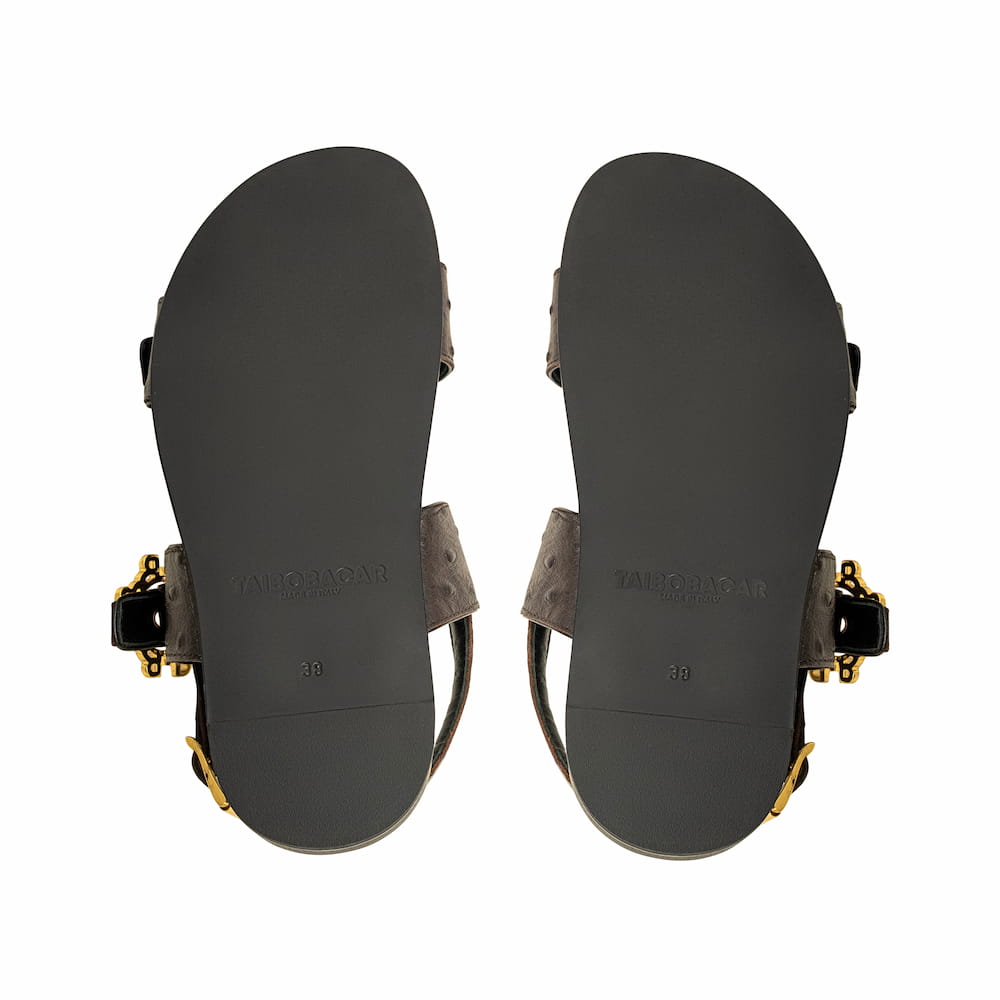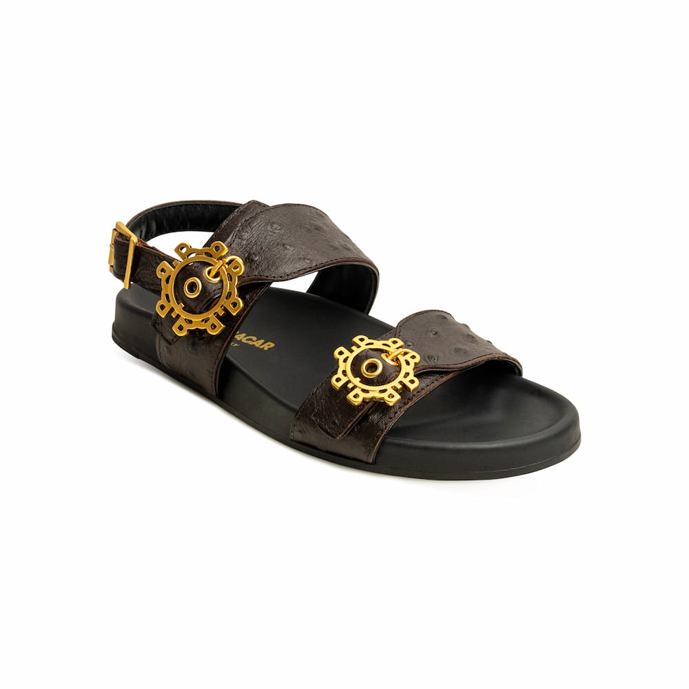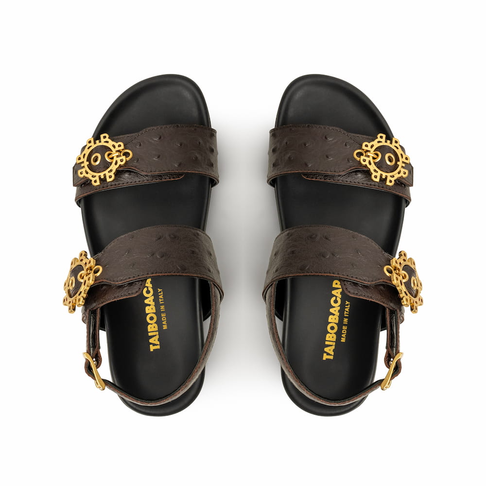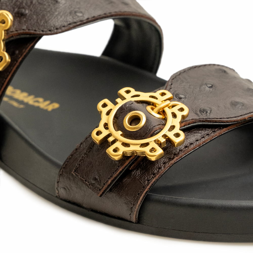 A re-interpretation of our slides for a more casual and extra comfortable look. With the choice of Croco or Ostrich leather, this design ties in both summer and resort season. Offering a buckle strap for added security, the sandal is easy-to-wear and adorned in golden details.