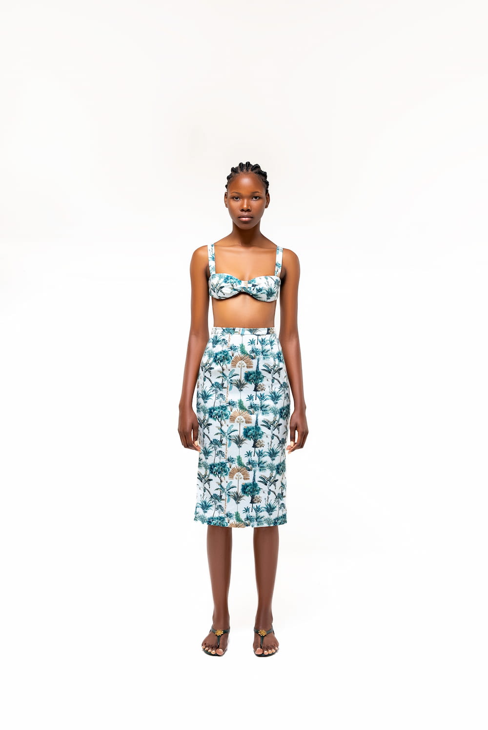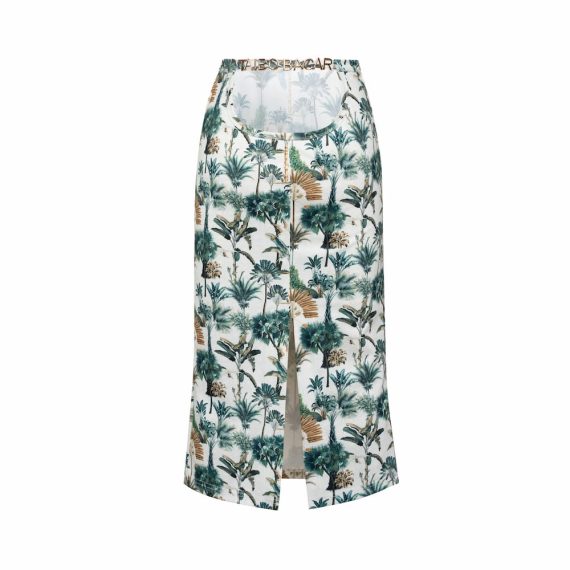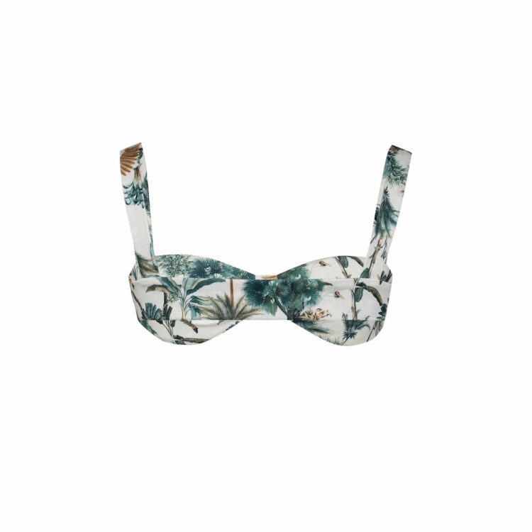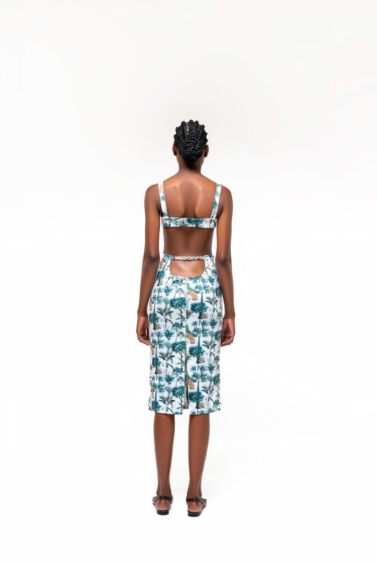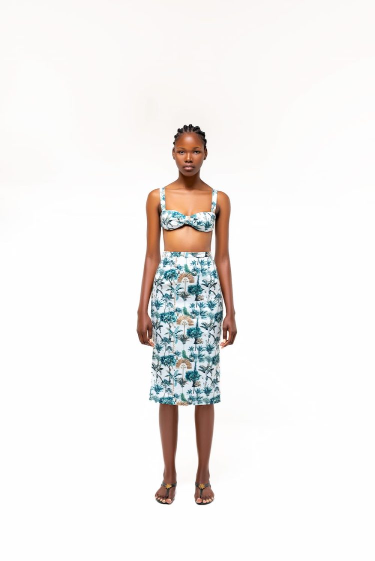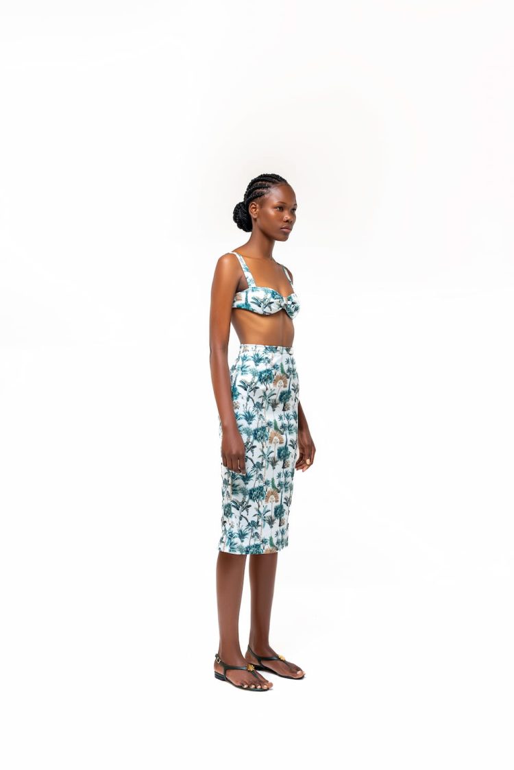 A contemporary staple crop top with an elegant eveningwear feel in our Resort print. Ideal for warmer nights by the beach or a closed dinner. Delicate and femine with an exposed bustier that adds to the chic aspect of the collection.