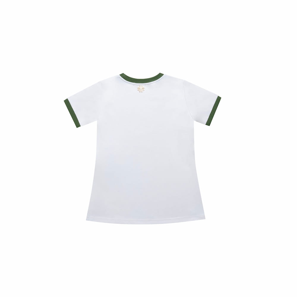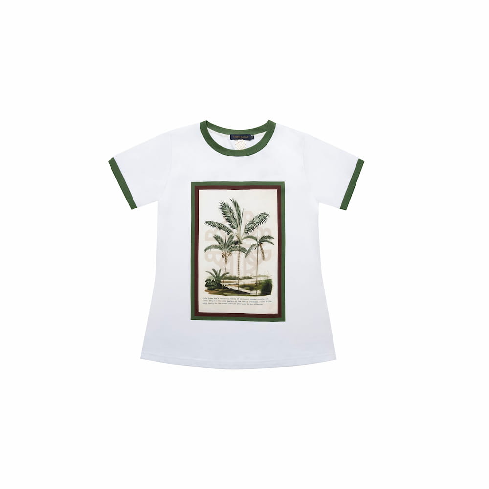 Graphic T-shirt featuring palm trees motif screen-printed on the front in earth-tone colors on a white canvas. Medium-weight stretch jersey piece featuring a metal TB logo at the back.