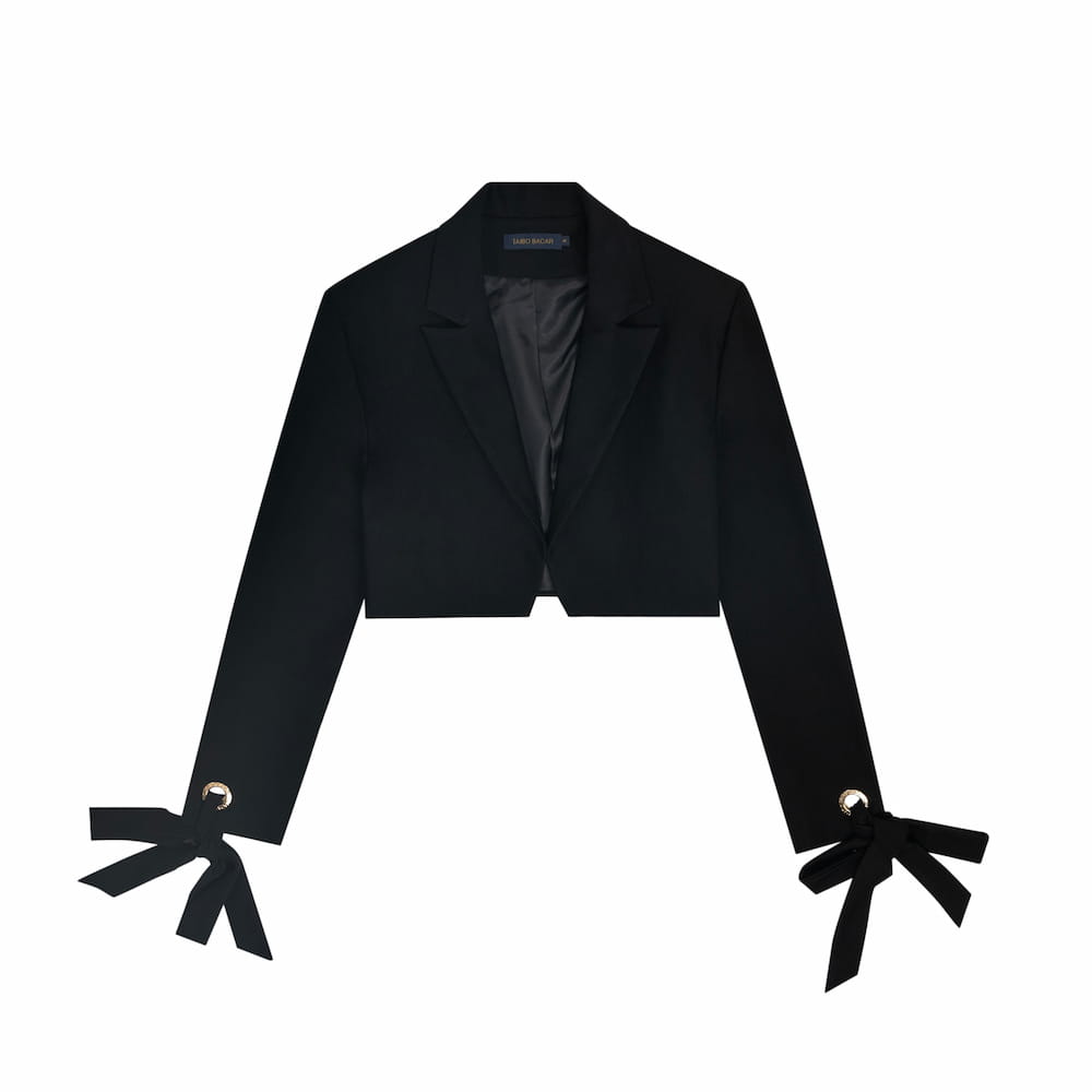 A timeless cropped jacket, perfect for a casual evening or to elevate an evening look. With ties on the sleeves and our TAIBO BACAR logo at the back, this jacket is a staple piece to add to your wardrobe.