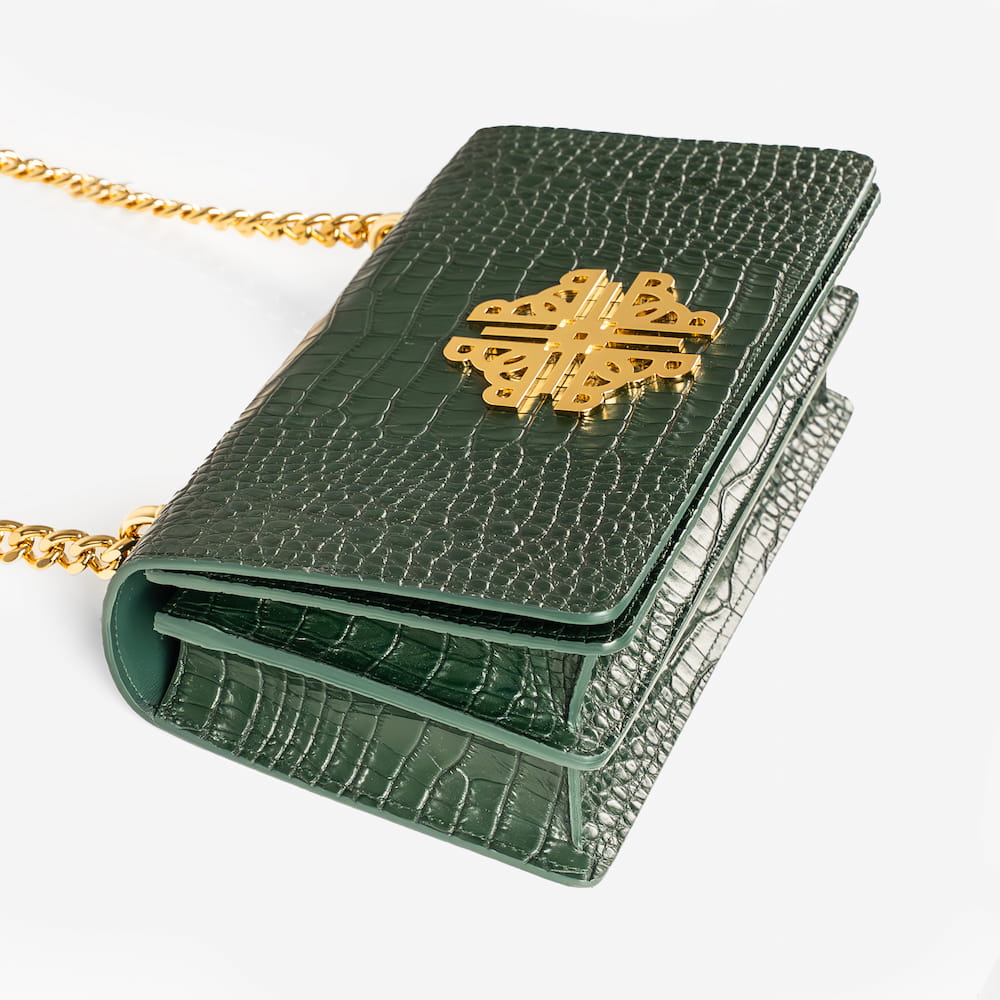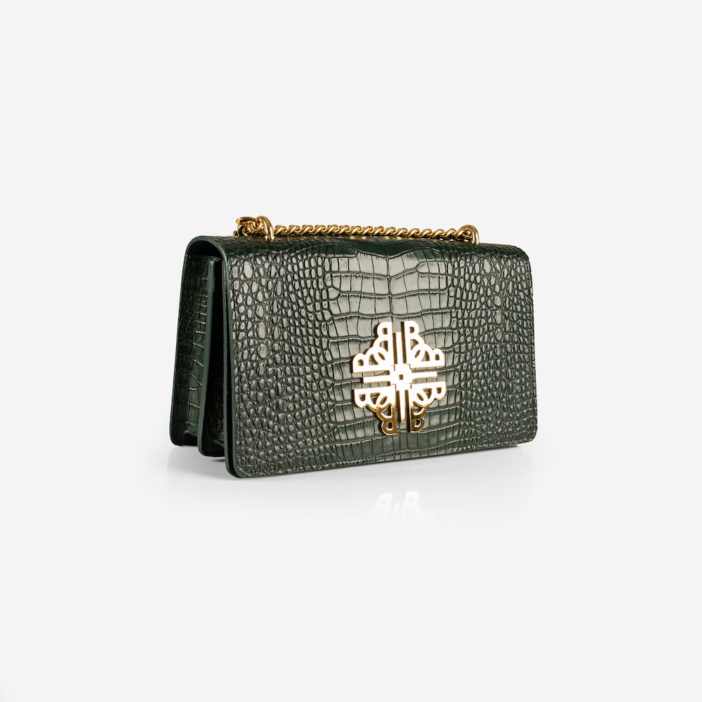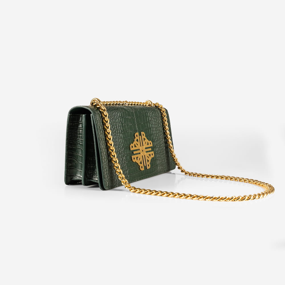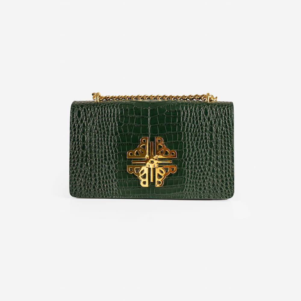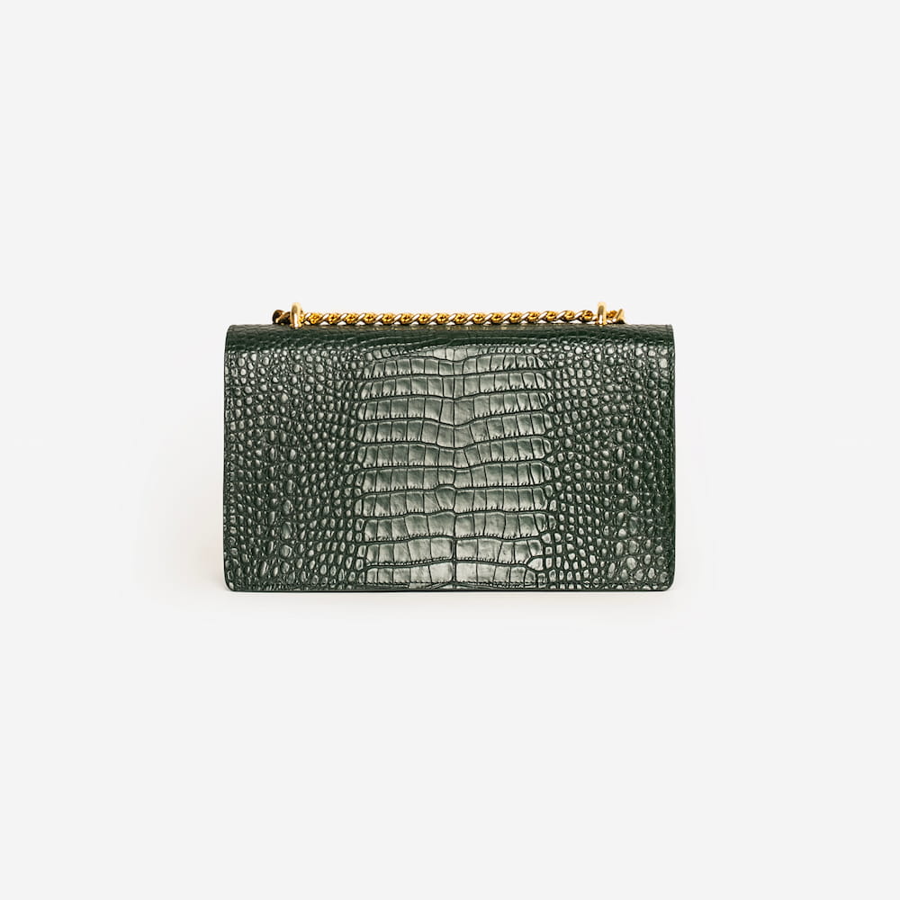 The Selma Bag in Green Croco leather is an ideal bag for everyday wear. Created as an evolution of the Shana Bag with a well-organized interior for daily essentials. A classic east-west silhouette with a gold chain and a metal gold TB logo – perfect to be worn over the shoulder.