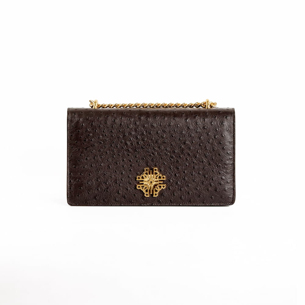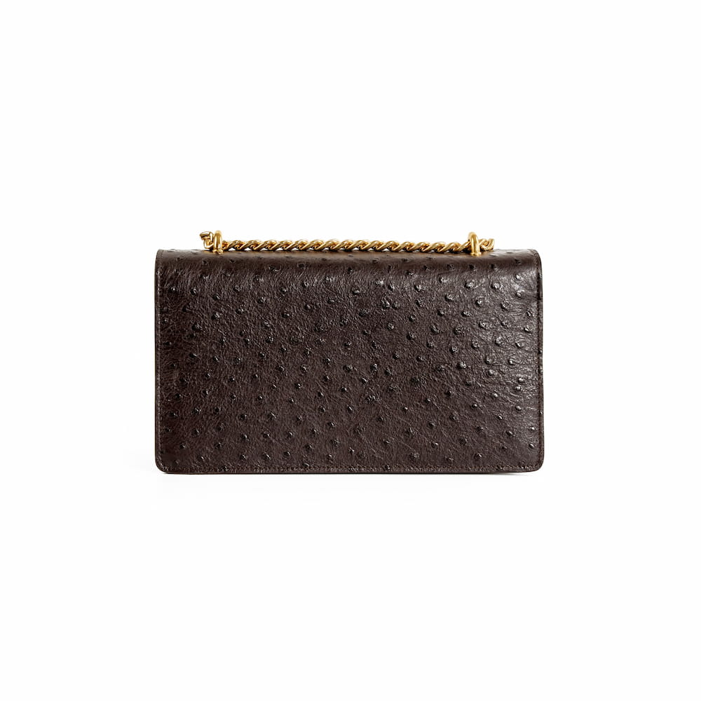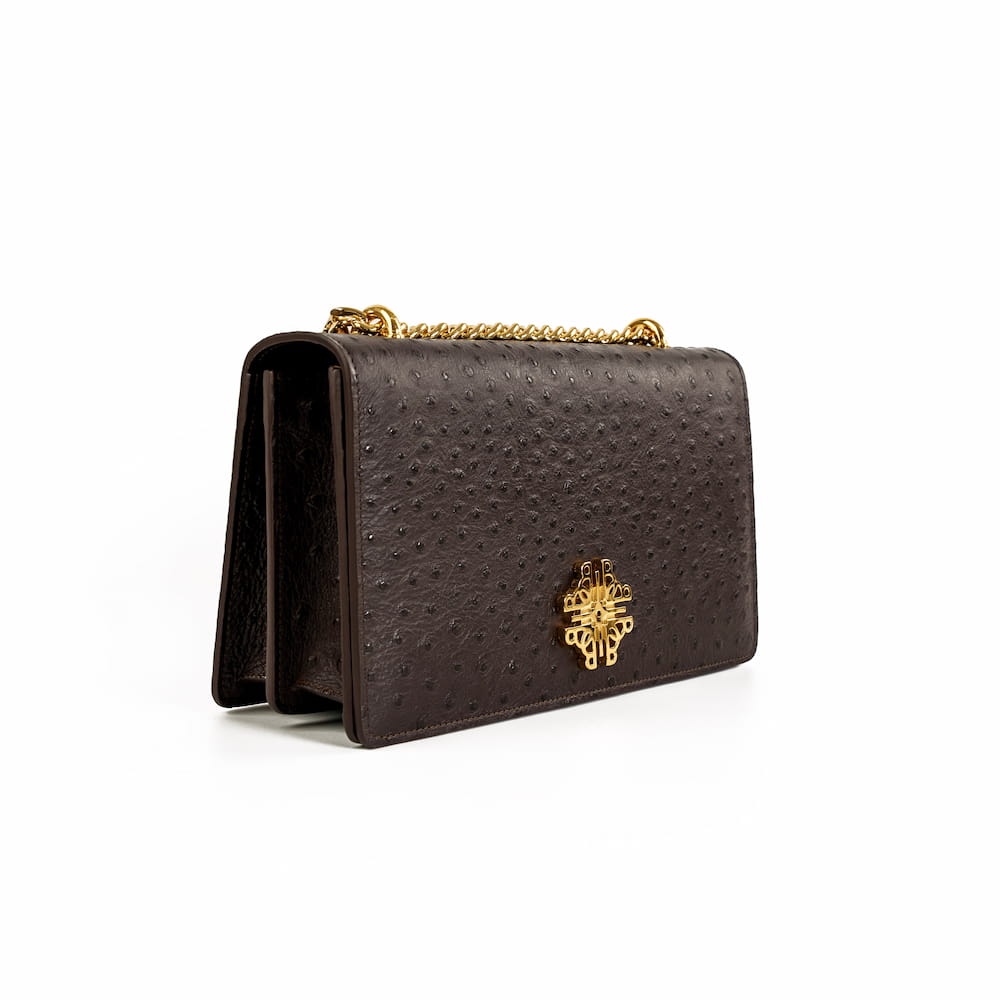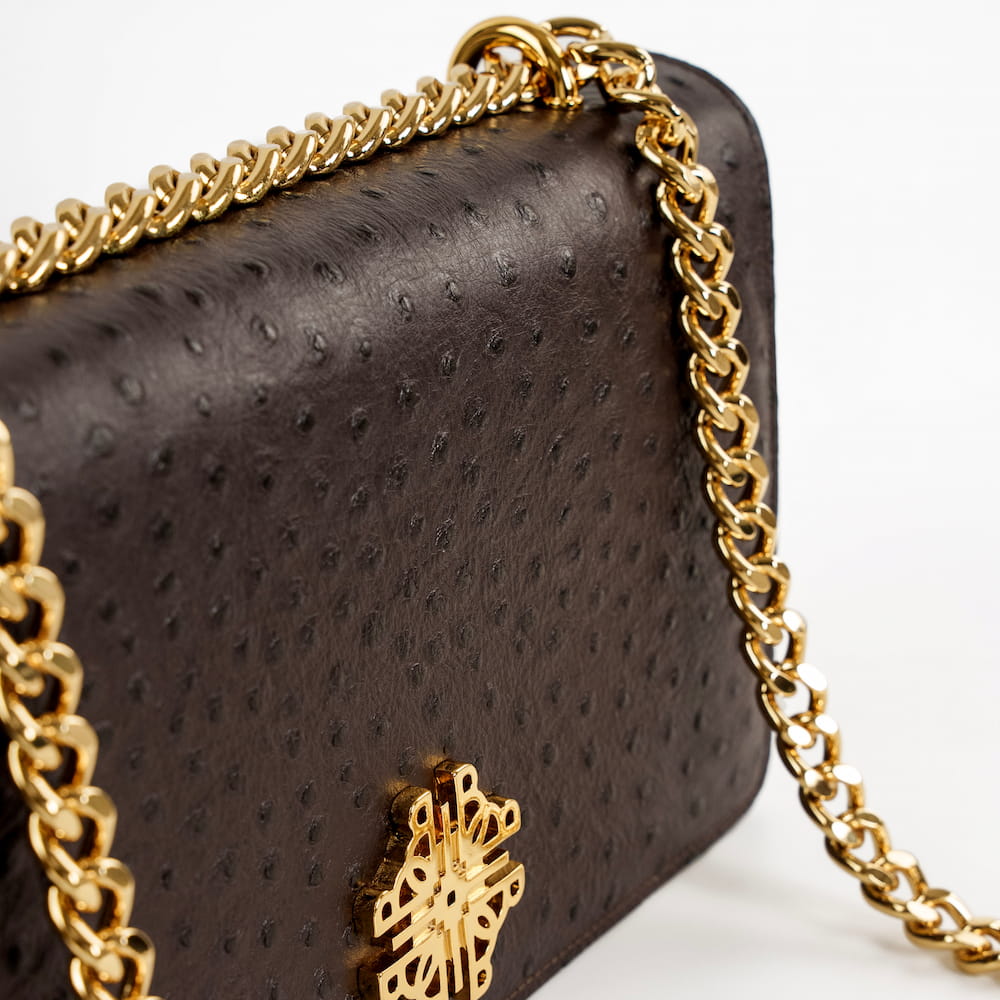 The Selma Bag in Brown Ostrich leather is an ideal bag for everyday wear. Created as an evolution of the Shana Bag with a well-organized interior for daily essentials. A classic east-west silhouette with gold chains and a metal gold TB logo – perfect to be worn over the shoulder.
