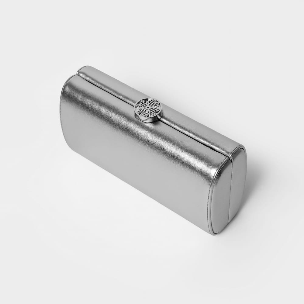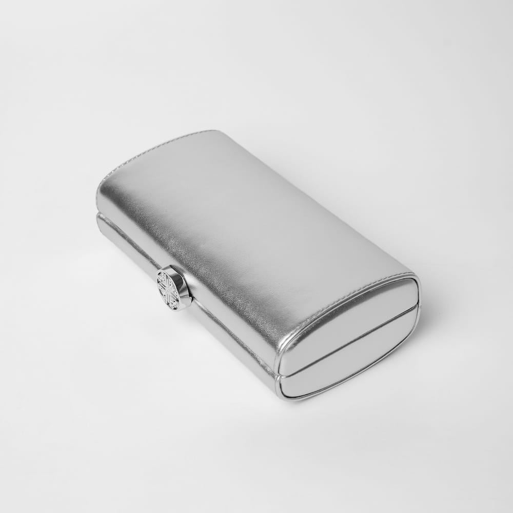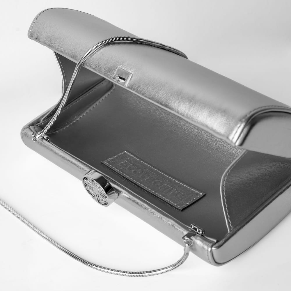 Clutch bag in calfskin fabric with a thin shoulder strap. Ideal to be held or worn crossbody. Lined in silver, with a TB clasp for added detail and maximum security.