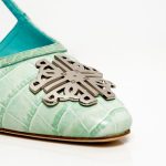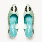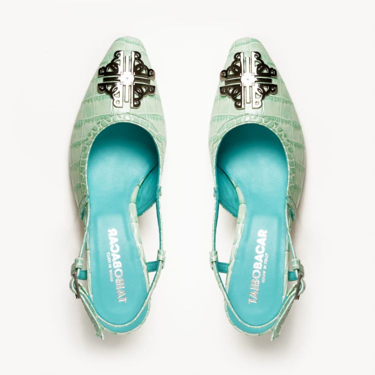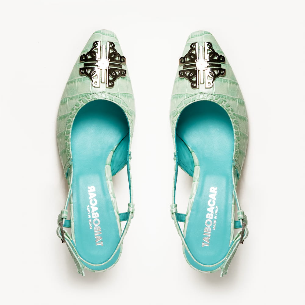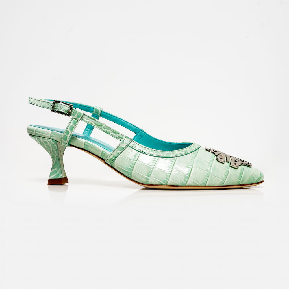 Slingback pointed shoes with 5.5 cm heels. Adorned in our croco printed leather, featuring gold or silver variations of our TB logo. In four different colours.