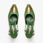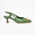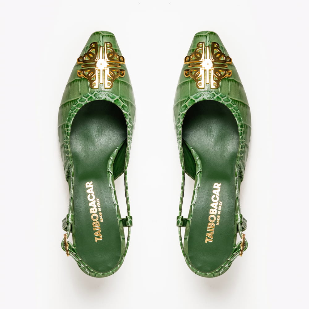 Slingback pointed shoes with 5.5 cm heels. Adorned in our croco printed leather, featuring gold or silver variations of our TB logo. In four different colours.