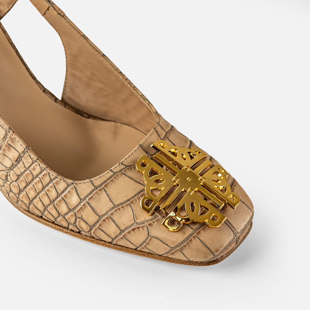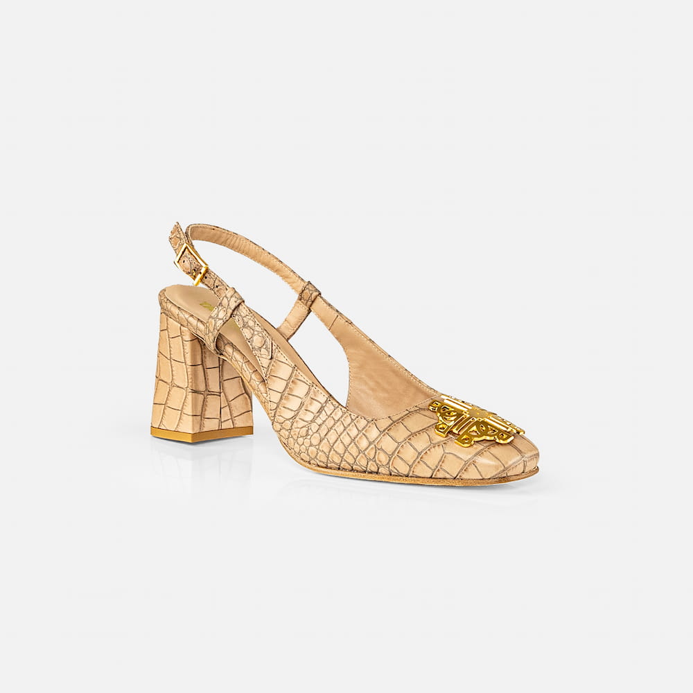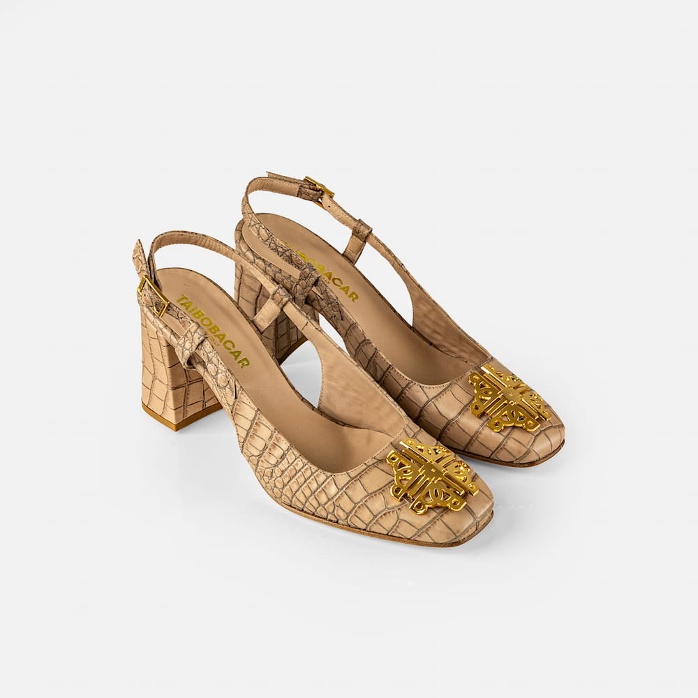 New TAIBO BACAR slingback shoes. High block heels in our famous croco leather skin. Featuring a gold TB logo and in three different colors.