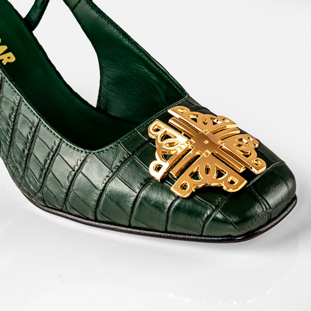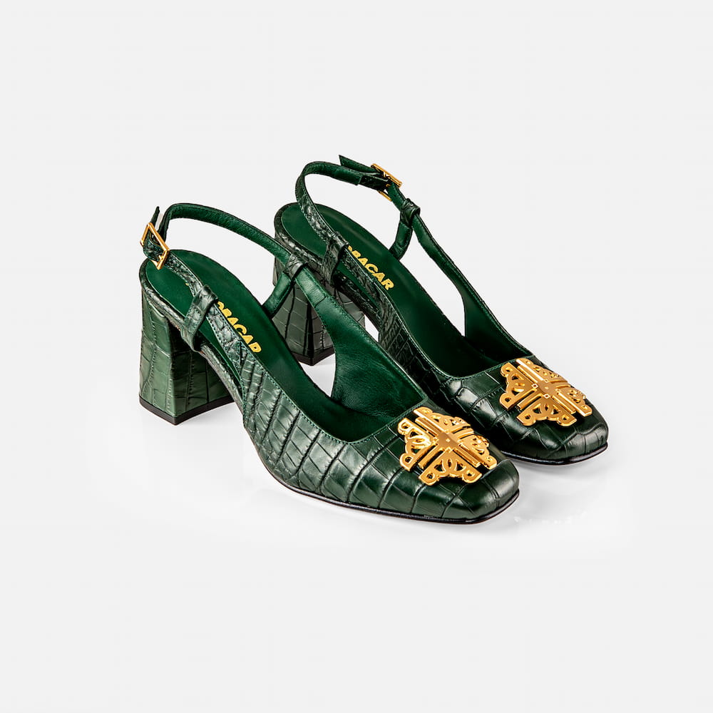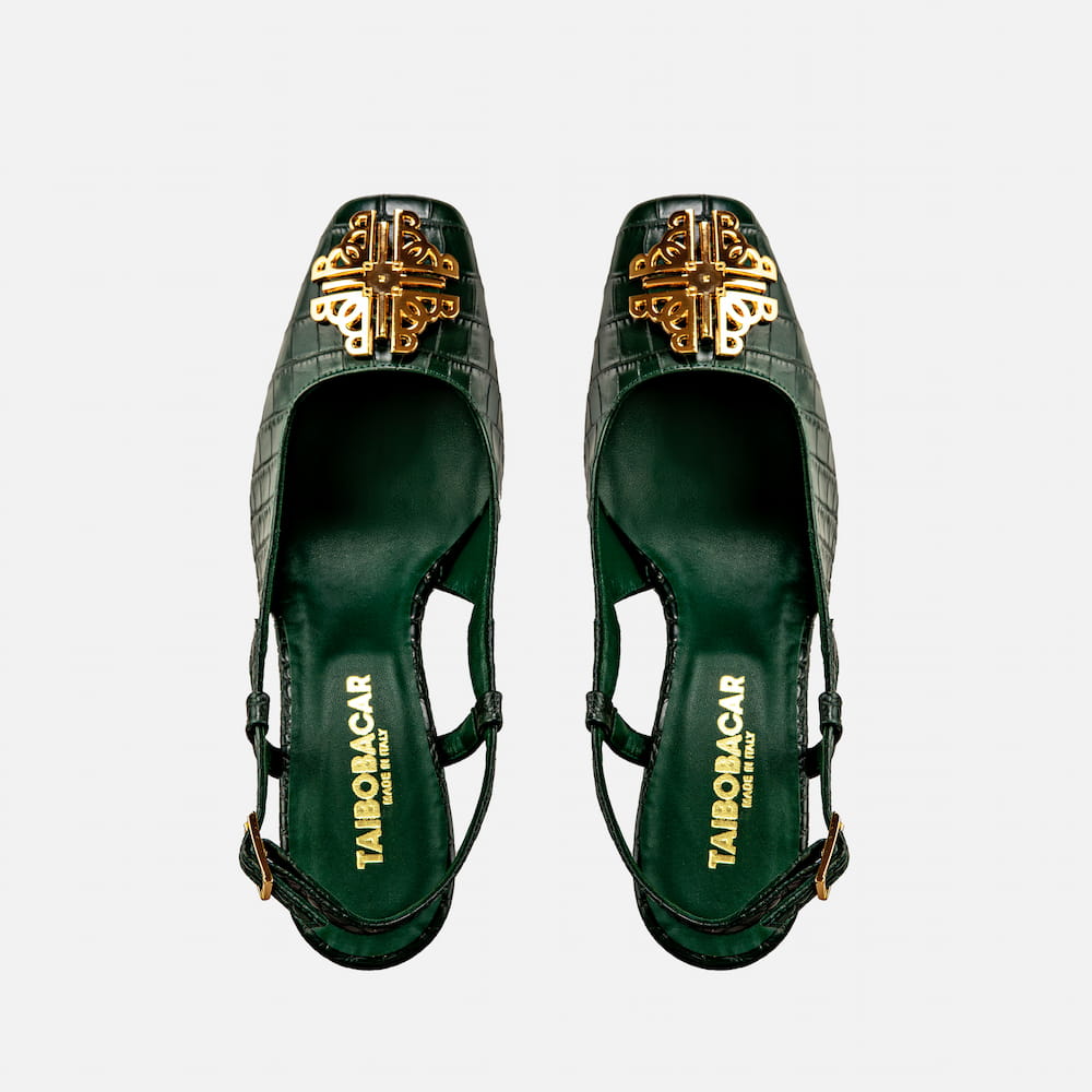 New TAIBO BACAR slingback shoes. High block heels in our famous croco leather skin. Featuring a gold TB logo and in three different colors.